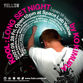 2007.9.28 (FRI) KOOL @ YELLOW LONG SET NIGHT by KO KIMURA (open till last!) DJ: KO KIMURA (FUTIC RECORDINGS TOKYO) VJ: E-MALE (www.e-m-a-l-e.com) B1 NANO LOUNGE: YUKINA (Euphoria), ZUYACK (selfservice), 墨(HG), AKKY(CROOKLYN), MAEZAWA (PTOLEMY), ILNOA (NOIR) FOOD: Kitchika OPEN: 10pm DOOR: 3000 YEN (1D) / WITH FLYER: 2500 YEN (1D) INFORMATION: 03-3479-0690 YELLOW http://www.club-yellow.com/ http://www.futic.com/ 毎月最後の金曜にYELLOWで開催の"KOOL"はDJ歴22年の木村コウにとってホ