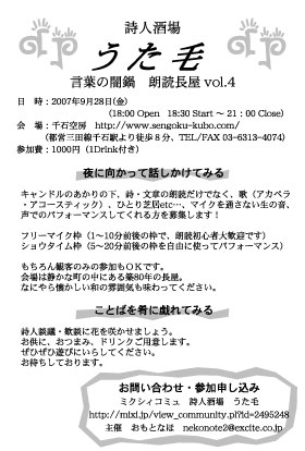 ★朗読会を開催します。 会場:千石空房 (http://mixi.jp/view_community.pl?id=479543) (都営三田線千石駅より徒歩8分、TEL/FAX 03-6313-4074) 参加費:1000円(1Drink付き) ○ 夜に向かって話しかけてみる キャンドルのあかりの下、詩・文章の朗読だけでなく、歌(アカペラ・アコースティック)、ひとり芝居etc…、マイクを通さない生の音、声でのパフォーマンスしてくれる方を募集します! フリーマイクタイムとショウタイムの二部構成を考えています。 フリーマイク枠(1〜10分前後の枠で、朗読初心者大歓迎です