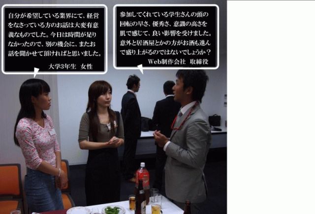 立ち上がるために何をした 負けないために何をした 強くなるために何をした 泣かないために何をした 結果を出すために何をした 白旗をふるのはまだまだ早いよ。 君の『チカラ』を見せてやれ 161万7000社がしのぎを削るこの経済大国日本で、 激しい闘いに日々勝ち残り、生き残り、利益を出し続け、 社会貢献しつづける猛者(モサ)経営者達がいる。 君達と同じ年齢ですでに、年収1000万円を超える アントレプレナー(起業家)達がいる。 彼らが今09就活生に伝えたいことを真