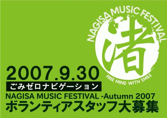 こんにちは、ごみゼロ関西です。 今週日曜に行われる渚音楽祭で一緒に活動してくれるボランティアスタッフ大大大募集してます! 音楽を楽しみながら、同世代の仲間と一緒に、フェスをつくりあげましょう! 締め切りは明日26日までです! 下記にあるごみゼロ関西WEBサイトの申し込みフォームから、お申し込みください。 たくさんの応募待っています★★ ●○●○●○●○●○●○●○●○●○● ごみゼロナビゲーションin 渚音楽祭2007秋 9月30日(日) 環境対策ボランティア大・大・大募集!! ●○●○●○
