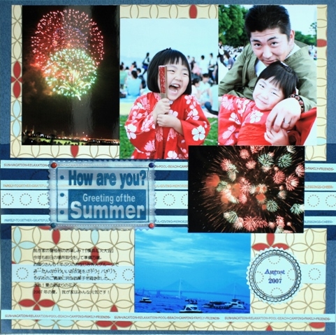 ぷらいむです。 残暑お見舞い申し上げます! 今年の夏も暑いですね^^; 皆さんはいかがお過ごしでしょうか?! 前回のコミュイベントから少々時間が経ってしまいましたが… このへんで新しいイベントをUPしてみたいと思います。 海に山に、色々とお出かけすることの多いシーズン。 スクラッパーならカメラは必需品! 楽しい思い出をしっかり撮ってこられたことでしょう! そんな、夏の写真を使って、12インチレイアウトを作ってみませんか? 今回は「Enjoy! Blue Summer」ということで… ?『夏の写真』を使用すること(いつの