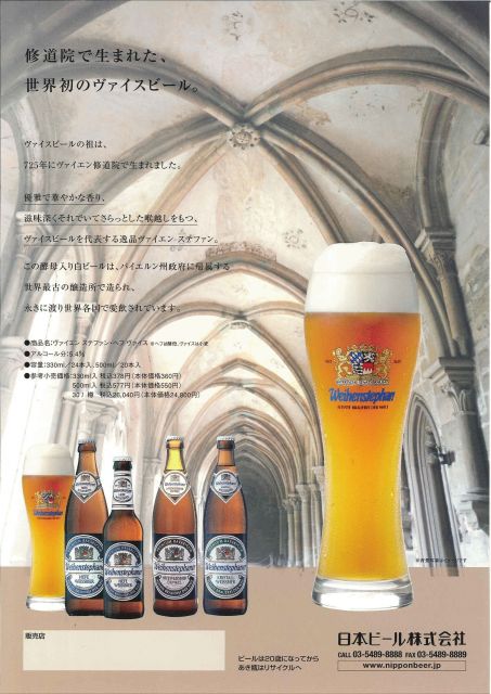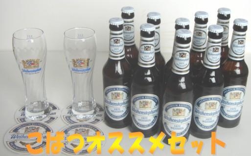 ご自宅でもWeissbierを堪能したいあなた! 近くでWeissbierが飲めるお店がないあなた! ご近所にWeissbierが買える酒屋がないあなた! 格安でグラスもセットで欲しいと思ってるあなた! 超朗報です! 現存する世界最古の醸造所Weihenstephanの輸入代理店日本ビール(株)とWeissbierコミュ管理人こばつの共同企画です!これは9月末までの期間限定超お得企画です! Weihenstephan Hefe-Weissbierの330ml瓶10本 Weihenstephan専用グラス2個 Weihenstephanコースター 4枚 Weihenstephanポスター 2枚 Weihenstephanパンフ 2枚 これ