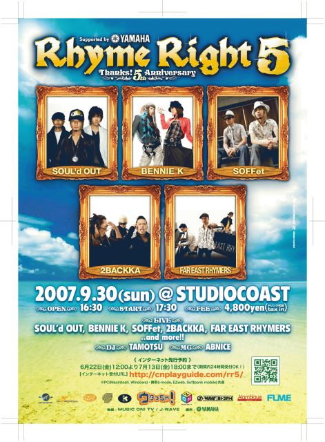 今年で5年目を迎えるHip Hopの祭典Rhyme Right5! 今年で5周年を迎え、イベントもスケールアーップ! Resident Artist Bennie K SOUL'd OUT SOFFet 2BACKKA に加え、サプライズゲストもあるかも!?要チェック! イベント名:Rhyme Right5 日時:9月30日(日)開場16:30 開演17:30 会場:新木場 STUDIO COAST 料金:4800円(ドリンク代別途) web先行予約 http://cnplayguide.com/rr5/ 出演: SOUL'd OUT/BENNIE K/SOFFet/2BACKKA/FAR EAST RHYMERS...and more! DJ TAMOTSU/MC ABNICE 一般チケット発売日:8月31日 mixiコミュ