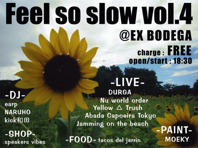 ■□■□■Feel so slow vol.4■□■□■ 2007.9.30(sun) @EX BODEGA →http://www.ex-bodega.com/ OPEN/START 18:00 CLOSE 23:00 charge FREE!(投げ銭制) [LIVE] Jamming on the beach →http://www.kanazawa.or.tv/main/soundsgallery.htm Abada Capoeira Tokyo(カポエラ演舞) →http://www.abadatokyo.com/ DURGA →http://sound.jp/durga/ Yellow △ Trush Nu World Order [DJ] NARUHO →http://blog.livedoor.jp/naruhorizonbeat/ earp →http://www.beatstroganoff.com/ kick 和田 →ht
