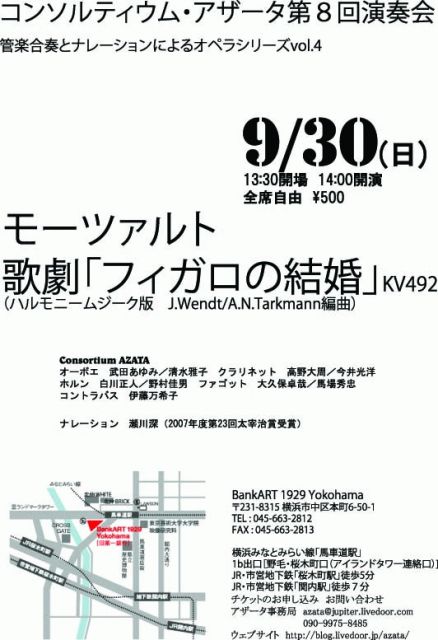 OBです。以下宣伝です。よかったら来てください。 コンソルティウム・アザータ 第8回演奏会 日時: 2007年9月30日 14:00開演(13:30開場) 場所: BankART1929 Yokohama 入場料:500円 モーツァルト(ヴェント&タークマン編曲)/「フィガロの結婚」〈管楽9重奏版〉KV492 ナレーション(特別ゲスト):瀬川深(第23回太宰治賞受賞) 「魔笛」「ドン・ジョヴァンニ」「コジ・ファン・トゥッテ」に続く第4弾!会場は横浜・馬車道。かつて銀行として使われていた歴史的建造物で演奏します。管楽編曲版あらすじナレーション付きで