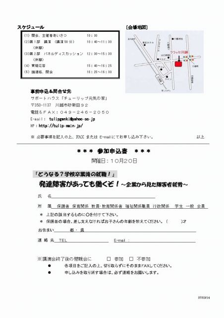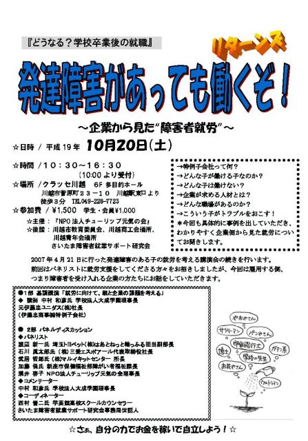 転載、お知らせ歓迎! 10月20日(土)チューリップ元気の会が主催して発達障害のある子どもたちの就労を考える講演会&パネルディスカッションを川越で開催します。前回、講演いただいた西村晉二先生にコーディネータをお願いしております。企業の障害者雇用の視点から見た就労への保護者に対するメッセージに期待してます! どうなる!卒業後の就職!発達障害があっても働くぞ!リターンズ 〜企業から見た”障害者就労”〜 →特例子会社って何? →どんな子が働ける子なのか? →企業が求める人材とは? →どんな職場があるのか