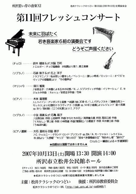 第11回フレッシュコンサートのご案内です。 (松井クラシックのつどい第193回定期演奏会) プログラム 鈴木穂波(チェロ)pf.大脇万莉 エルガー:チェロ協奏曲 ホ短調より 石鍋敦子(ソプラノ)pf.石上洋子 ラフマニノフ:私は悲しい愛をした/ベッリーニ:激しい要求 ロッシーニ:セビリアの理髪師より「今の歌声は」 深川智美(マリンバ) 安倍圭子:六本發による五木の幻想/竹林 ジブコヴィッチ:イリヤーシュ/セジョルネ:Nancy 木米真理惠(ピアノ) ハイドン:アンダンテと変奏 ヘ短調/西村朗:「三つの幻