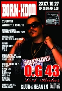 2007.10.27 新所沢@HEAVEN 『BORN HOOD』 【OPEN】 PM 10:00〜AM 5:00 ・?2000[1DRINK] ・with ?1500[1DRINK] 【RELEASE LIVE】 ・JAMMY(RIVA RUNZ ENT) 【RELEASE DJ】 ・DJ SATORU 【GUEST LIVE】 ・O.G43(LA'RIDAZ) 【LIVE】 ・MONA(Lily) ・DIX-T ・T.K.O 【BORN HOOD DJ'z】 ・G-SHOT ・KENY LUV ・C.I.N ・BOOSTAR ・MASS-G ・SHEI-LA ・TATSUYA 【PICK UP DJ'z】 ・SUGER SHOW(B.B.T) ・VAST(4.G.G) 【テキ〜ラガール】 ・N∀O & MARI 茨城からO.G43氏がBORN HOODに初登場です!! 更にmi