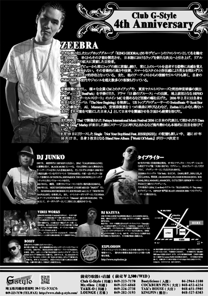 川越G-STYLE4周年 2007年10月20日(土)22:00 川 越 祭 当 日 当日4000円、W/F3000円、前売り2500円/1D ■前売りチケット取扱店舗---------------- ・Club G-Style (川越) 049-223-7170 ・Mr.vibes (川越) 049-225-6868 ・TAKE-O (川越) 049-226-2738 ・LOUNGE (若葉) 049-282-3193 ・Bootylicious (入間) 04-2964-1100 ・COCKBURN PEN (大宮) 048-652-6254 ・TAK'z HOUSE (大宮) 048-651-5905 ・KINGPIN (熊谷) 048-527-8303 ------------------------------------- ■Special Guest Live ZEEBRA