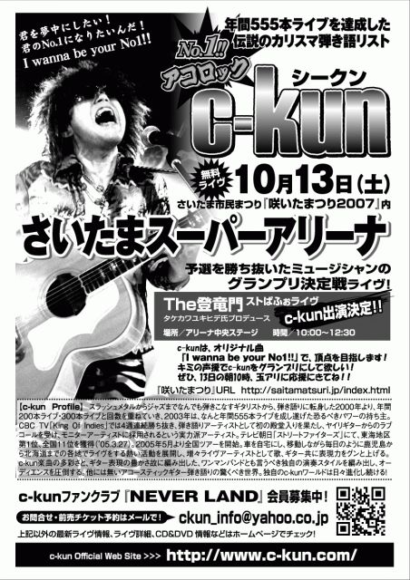 さいたまのストリートミュージシャンの熱い戦い『The登竜門ストぱふぉライヴ』! 1次と2次の予選を勝ち抜き、玉アリにて行われる決勝ライブに c-kunの出演が決定しました!! 参戦曲は「I wanna be your No.1」 この曲で文字通りNo.1を狙います!! そして、c-kunの演奏を盛り上げるのは皆の熱い声援です! 会場で配られるボールでの投票もあります! ライヴ観覧は無料! 是非是非、当日朝9:30、玉アリ中央ステージ前に応援に来てください!! 日時/10月13日(土)AM10:45〜 会場/さいたまスーパーアリーナ内1階中央ステージ 一般投票/30