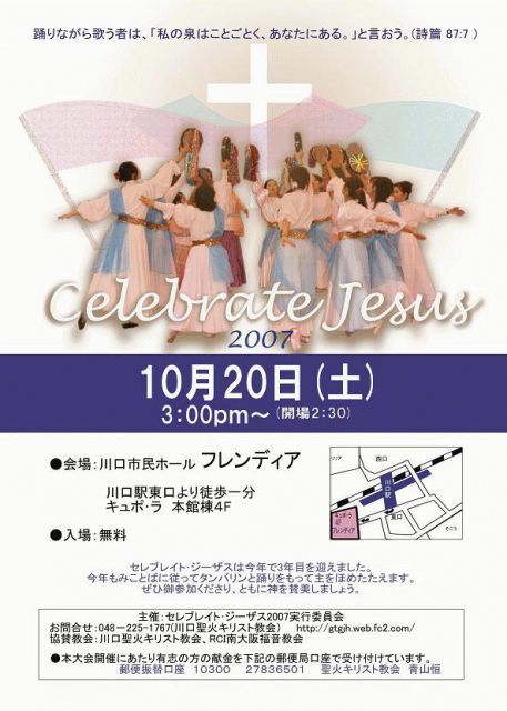 今年は、3回目となりました。 詩篇150篇4節 「タンバリンと踊りを持って 神をほめたたえよ。」 との、み言葉に従い、主を讃美致します。 今年は、20の教会、8チームが参加します。 http://gtgjh.web.fc2.com/ 是非一緒に神様を讃美し礼拝致しましょう。