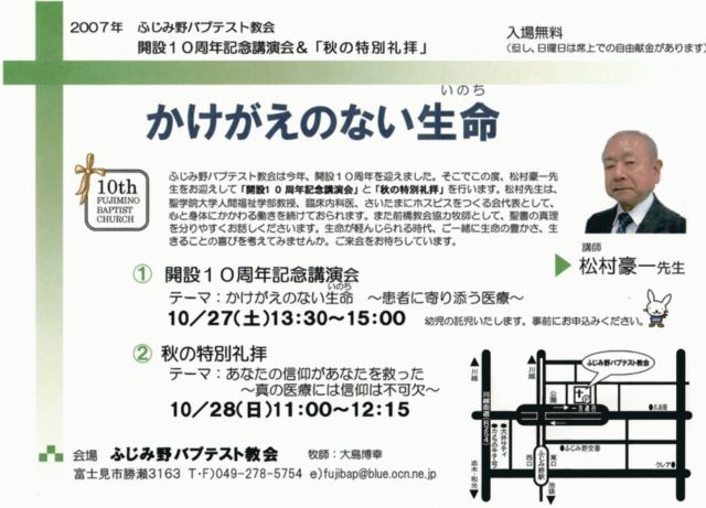 ふじみ野バプテスト教会は今年開設10周年を迎えました。 そこで、この度松村豪一先生をお迎えして「開設10周年記念講演会」と「秋の特別礼拝」を行います。 先生は聖学院大学人間福祉学部教授・臨床内科医・さいたまにホスピスを作る会代表として心と身体にかかわるお働きをされておられます。また前橋教会協力牧師として、聖書の心理を分かりやすくお話くださいます。 生命が軽んじられる時代にご一緒に生命の豊かさ、生きることの喜びを考えてみませんか?ご来会をお待ち申し上げております。 また教会HPにおいて、松村先生の紹介と