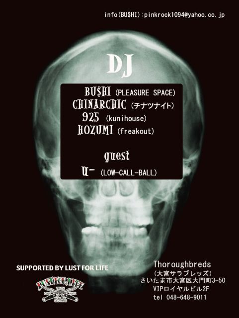 「HALLOWEEN xxx† sound party」 2007・10・28(SUN) @thoroughbreds(大宮サラブレッズ) STRAT 19:00 DOOR ¥1500(1d) ●DJ● BU$HI(PLEASURE SPACE) CHINARCHIC(チナツナイト) 925(kunihouse) HOZUMI(freakout) GUEST u-(LOW-CALL−BALL) SUPPORTED BY LUST FOR LIFE 今回はGUEST DJに関東を代表するパーティー集団!! LOW CALL BALLからu-君が参戦決定!!! そして今回はROCKSTYLE BRAND LUST FOR LIFEからのサポートを受けまして。 抽選で数名様に素敵なプレゼントもご用意!!!
