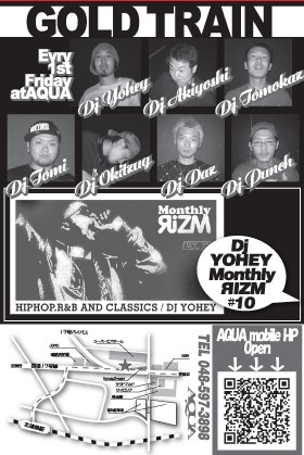 『GOLD TRAIN』 BLAZIN HIPHOP R&B & GOOD MUSIC!!! -DATE- 07/10/05.FRI 埼玉県@鴻巣AQUA -OPEN- 10PM-5AM -CHARGE- DOOR:\1,500/1D W/F :\1,500/2D ADV :\1,000/1D -DJ- YOHEY(R-IZM) AKIYOSHI(R-IZM) TOMI TOMOKAZ OKITZUG DAZS PUNCH -LIVE- BIGFOOT 優心 OD DEEP VALLEY -DANCE- Shades Of Blue and more... 思わず手を扇ぎたくなるNEW SHITから、最近CLUBで聞きたかったのに流れなっかったあの名曲まで!幅広い選曲とVIBSで、始まったばかりの週末第一金曜日に、鴻巣AQUAであなたをLOCKしますぜ