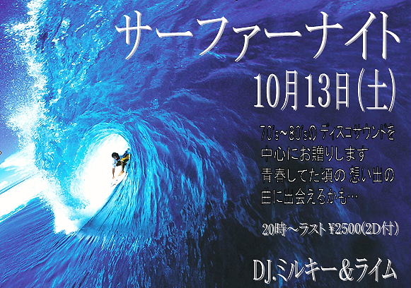 ミルキーと申します 埼玉県蕨市にある『DISCO JAPAN』にて ミルキー&ライム プレゼンツ70's〜80's DISCO サーファーナイト と言うイベントをやります。 選曲はもちろん、当時のディスコサウンドが中心です。 サーファーディスコが流行った時代、それが私達のテーマでもあります。 当時、ディスコに通っていた貴方、まだディスコは未体験だけど行ってみたいという貴方、ディスコジャパンでミルキー&ライムと一緒に楽しんでみませんか? 是非一度、遊びにいらして下さいね 場所:埼玉