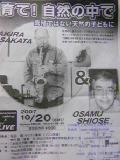 トーク主体のミニイベントです 「坂田氏が語り奏でるメッセージ」として、埼玉県飯能市で開校24年目を迎える自由の森学園中学校校長の塩瀬治氏と音楽・教育について語り合います。 坂田氏の独自の教育論が存分に楽しめる珍しいイベントです。 小中高生の同伴もOKだそうです。 ☆坂田明トーク&ミニライブ☆ 「育て!自然の中で−養殖でない天然の子どもに」 主催:自由の森学園中学校・高等学校 講演:坂田明、対談:塩瀬治(自由の森学園中学校校長) 日時:2007年10月20日(土)開場[18:15]開演[18:30] 場所:狭山市市民会館小