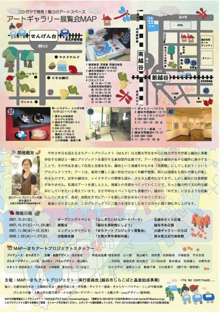 コミュニティの皆様、こんにちは。 私達はアートで地域をまるごと「美術館」にしてしまおう!という活動をしています。 この度、「まちアートプロジェクト―越谷 2007―」 開催の運びとなりましたのでお知らせさせていただきます。 「まちアートプロジェクト―越谷 2007―」 開催 「まちアートプロジェクト」とは、文教大学学生を中心にした学生、作家のアート作品を越谷の色々な場所(今年度は40箇所)に展示することで、地域住民と交流を生み、越谷という地域そのものを「美術館」にしてしまおう!というプロジェクトで