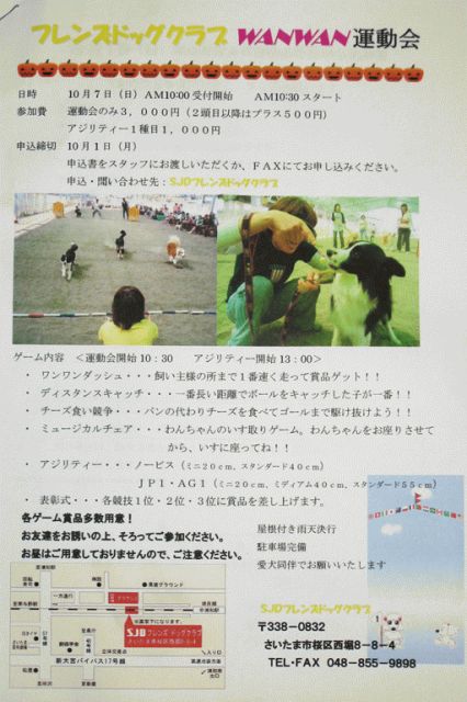 WANWAN運動会&SJD杯。 追伸 クラブ参加者以外の方(一般の方も)参加できます。 見学はご自由に。 10時受付開始。屋根付きフィールド(雨天決行)駐車場完備 WANWAN運動会 10時30分 スタート 参加費 3000円(2頭目以降+500円) イベント ワンワンダッシュ。 ディスタンスキャッチ。 チーズ食い競争。 ミュージカルチェア。 SJD杯 13時00分 スタート 参加費 1000円(1走) ノービス