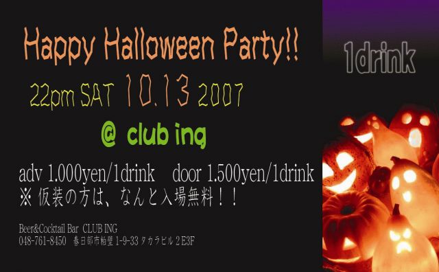 一足早く『ハロウィンパーティ』開催決定 ハロウィンといえばやっぱり『仮装』 当日は仮装orコスプレのお客様は入場無料 「仮装した格好じゃ恥ずかしくて来れない」 なんて方の為に更衣室も用意してますので 仮装の用意を持って遊びに来てください 一番目立った仮装をした方にはなにかイイ事あるかも オーガナイザーの『涅槃』メンバーも もちろん仮装して皆様をお出迎えしちゃいます 『Happy Halloween Party』@春日部ing produ