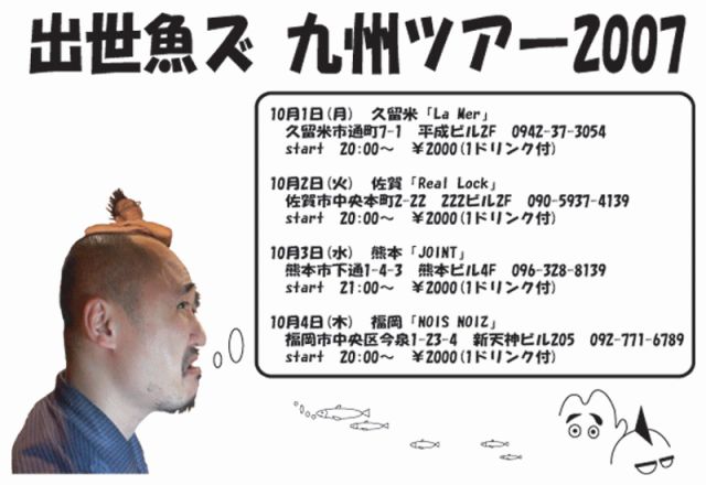 都内でのんびり活動している彼らをどうしても九州に呼びたくなって数ヶ月、ようやく実現したよ! よし!みんなの町へ行くぞー(ついでにボスエリも全部ついてくる!) エイエイオー! 10月1日(月) 久留米「La Mer」 久留米市通町7-1 平成ビル2F 0942-37-3054 start 20:00〜 ¥2000(1ドリンク付) 10月2日(火) 佐賀「Real Lock」 佐賀市中央本町2-22 222ビル2F 090-5937-4139 start 20:00〜 ¥2000(1ドリンク付) 10月3日(水) 熊本「JOINT」 熊本市下通1-4-3 熊本ビル4F 096-328-8139 start 21:00〜 ¥