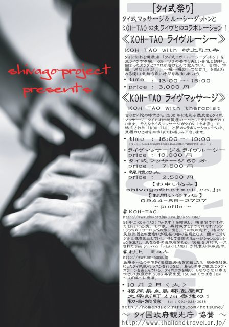 福岡の岩本です。 何か最近めっきり涼しくなってきましたね。 今年は秋が早いみたいですね。 いよいよ、ヌア・ボラーン合宿まであと1か月になりました。 まだ参加申し込みしてない方、どうしようか迷ってる方、申込お待ちしてます。 タイ政府観光庁にも協力して頂けるように決まりました! 2007 ヌア・ボラーン合宿in福岡 「タイ式祭り」 日時:2007年10月1日〜3日 会場:福岡県糸島郡志摩町大字新町476番地の1 初音旅館 http:// homepa ge2.ni fty.co m/hats une/ Tel:092-328-2038