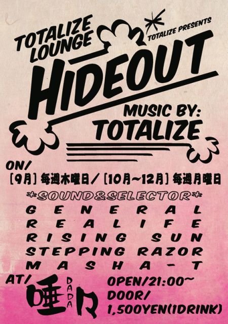 今回からHIDEOUT LOUNGEは月曜日に引越しします。