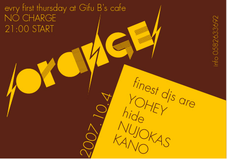 ◆Orange 2007.10.4(thu) @岐阜B's Cafe:058-263-3692 start 9pm〜mid no charge★ ‐DJ's‐ YOHEY、hide、NUJOKAS、kano ※前回のクボタタケシは最高でしたね! 今回はゲストなしのOrangeですが 皆様ヨロシクオネガイシマス!!!