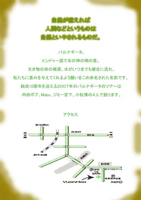 管理人様、告知失礼します。 なんやでのイベントではありませんが よろしくお願いします。 VARNA GHITA ACOUSTIC LIVE 自然が癒えれば 人間などというものは 自然と癒されるものだ。 2007.10.4(Thu) open 18:00 start 19:00 2500yen at Vuon Hoa(tajimi) バルナギータ アコースティックライブ 今回のツアーは、 内田ボブ(Vo.Gt.) MABO(Per.) ジミー宮下(サントゥール) 小松博(Gt.) の4人で廻ります。 70名限定です。当日は入場規制させていただく ことがあります。チケット(予約)はお早