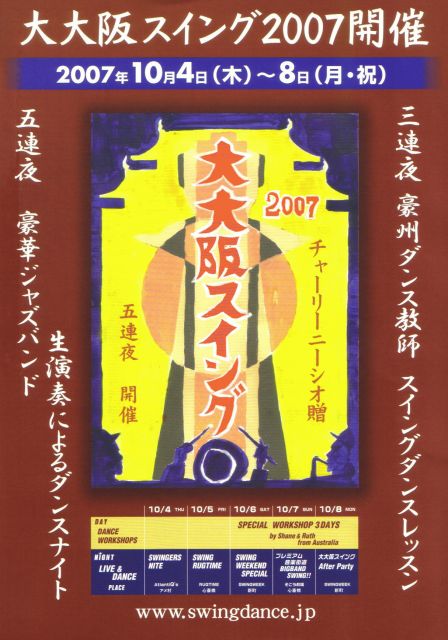 2007年10月4日(木)〜8日(月・祝) 連日スイングダンスレッスン 連夜ジャズ生演奏 10月6日〜8日の 昼間 シェーンマッカーシー(fromオーストラリア)ペアの スペシャルスイングダンスレッスン 詳細は、おって発表します。 ライブスケジュール 10月4日(木)スインガーズナイト 会場:アメリカ村アトランティックス09-6258-2525 中央区西心斎橋1-8-16中西ビルB1 開場:7時pm 開演:8時pm 出演:チャーリーニーシオ&ホットクラブエキスプレス(from東京) DJ:コイチ、タカノリ(バンザイスイングクルー) 前売り:2500円 当日3