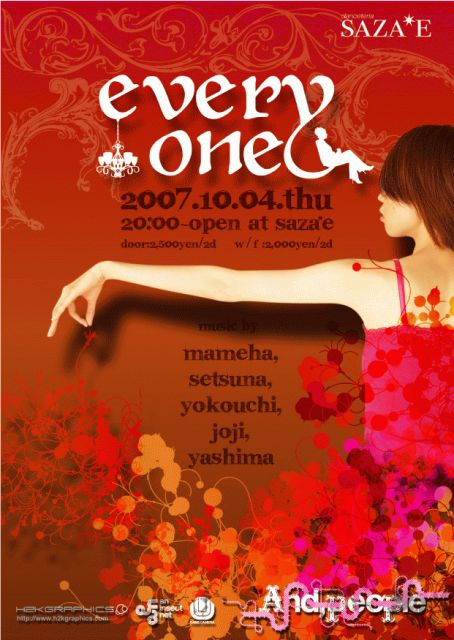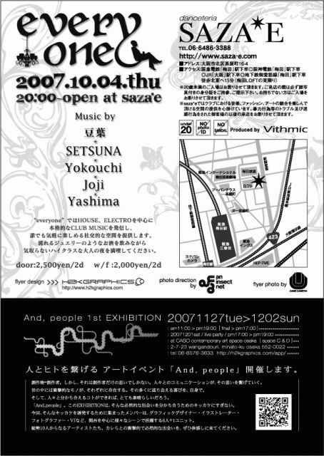 2007.10.04.thu everyone @SAZA*E door:2500yen w2d w/f:2000 2d OPEN/START:20:00〜1:00 MUSIC by 豆葉 SETSUNA YOKOUCHI JOJI YASHIMA VJ Fumiaki Nakayama sisterfood http://saza-e.com/