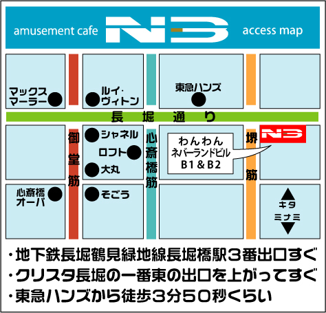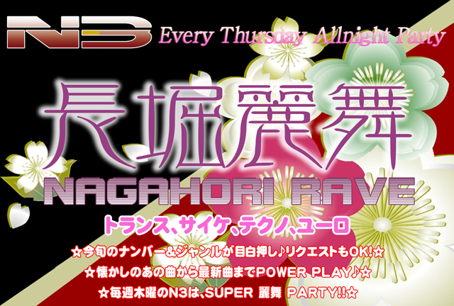 管理人様告知失礼します。 開催日時: 毎月木曜日(22:00〜) 開催場所: 大阪市長堀橋交差点「N3」 今話題の新クラブ「N3」の毎週木曜日のイベント! N3の木曜をリニューアル!そして、あのイベントをリバイバルして再始動いたします!! DJ 陣も新メンバーを揃えパワーアップ! その名も... 『長堀麗舞~NAGAHORI RAVE~』 トランス、サイケ、テクノ、ユーロ All Mix Party!! 毎週木曜オシャレで遊び好きな皆さんの"遊び場 "的イベントとして 飲むもよし☆踊るもよし☆選曲の方も幅広い年齢層の