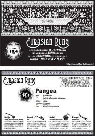 毎年行われたきた、“Eurasian Rung”ライブですが、 2代目パンゲアに変わった今年も、 ユーラシアン・ルンのライブあります!! 楽しみにされていた方も多いはず!! ぜひ、お越しください!! 前売り券、販売開始します〜♪ ---------------------------------- EURASIAN RUNG LIVE @Pangea ---------------------------------- いろいろな国の調べに根ざすオリジナルの楽曲 様々な学期を駆使した即興性の高い演奏 ユーラシアの悠久の大地をイメージさせるサウンド 音楽集団 ユーラシアン・ルン ライブ!! Eurasian Rung 公
