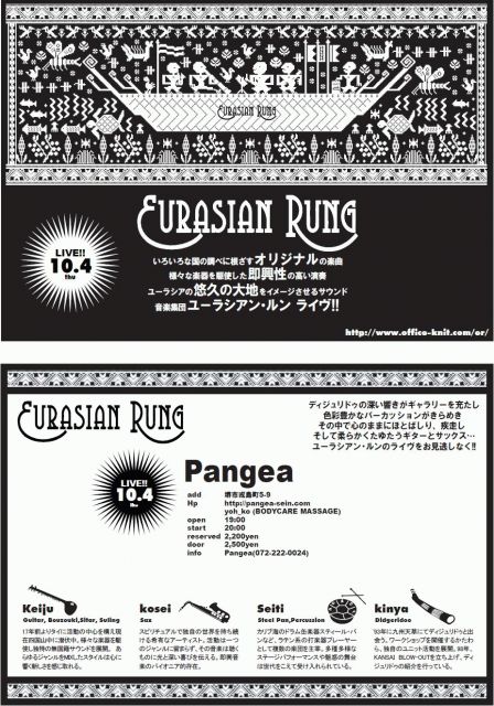 イベントの告知をさせていただきます。 よろしくお願い申し上げます。 ---------------------------------- EURASIAN RUNG LIVE @Pangea ---------------------------------- いろいろな国の調べに根ざすオリジナルの楽曲 様々な学期を駆使した即興性の高い演奏 ユーラシアの悠久の大地をイメージさせるサウンド 音楽集団 ユーラシアン・ルン ライブ!! Eurasian Rung 公式サイト http://www.office-knit.com/er/ ディジュリドゥの深い響きがギャラリーを充たし 色彩豊かなパーカッションがきらめき その中で心の