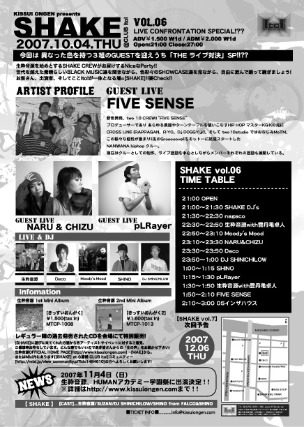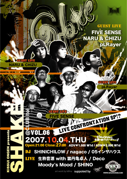 ■生粋音源Present's [SHAKE] Vol.6■ [日時] 2007.10.04.THU (偶数月 第1木曜日開催!) [場所] 心斎橋CLUB ItoI [時間] Open:21:00 Close:3:00 [Ticket] ADV¥1.500 W1d ADM¥2.000 W1d -Vol.6 出演者- [Guest Live] FIVE SENSE NARU&CHIZU pLRayer [LIVE] 生粋音源 feat. 雲丹亀卓人 Deco Moody's Mood SHINO INARI [DJ] SHINICHILOW nagaco 05インザハウス ※さあさあ、やって来ました!イベントの秋! 今回のテーマは「The LIVE対決」! それぞれ違ったフィルターを通して