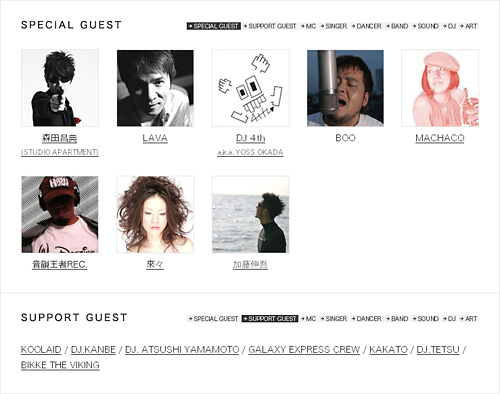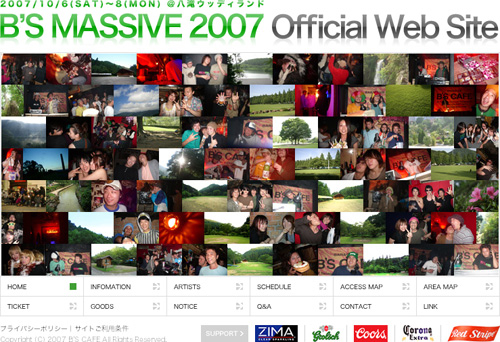 『B'S MASSIVE 2007』 B'S CAFEの生誕10周年を記念して開催される野外BIG PARTY『B'S MASSIVE』!!! 森田昌典(STUDIO APARTMENT)、BOO、LAVA、DJ 4th a.k.a. YOSS OKADA、音韻王者REC、MACHACO、來々、sing-O、など岐阜と馴染み深い数々のビッグゲスト&スペシャルゲストの他、総勢150組を超えるDJ、SOUND、MC、SINGER、DANCER、BAND、GRAFFITI ARTIST、DECORATERが競演!! 岐阜史上、類を見ない野外フェスの誕生です。しかも2泊3日、何と3DAYS!!! ジャンル、世代、性別、言葉、全ての“壁”を取り払って