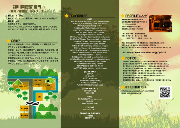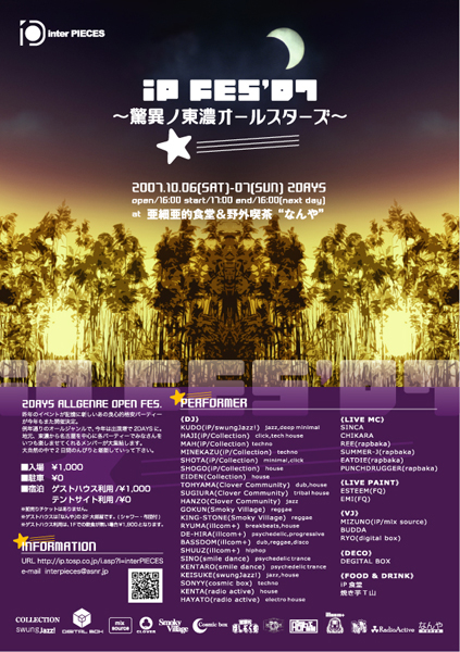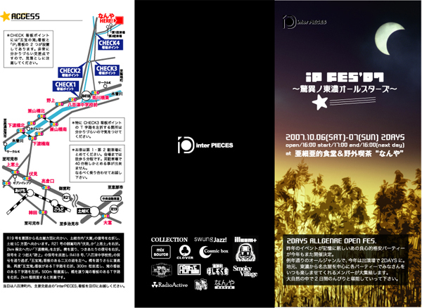 interPIECES iP fes'07 〜驚異の東濃オールスターズ〜 2007.10.06(sat)-07(sun) 2days open/16:00 start/17:00 end/16:00(next day) at 亜細亜的食堂&野外喫茶“なんや” 2DAYS ALLGENRE OPEN AIR FES.. 昨年のイベントが記憶に新しいあの良心的格安パーティーが今年もまた開催決定。 例年通りのオールジャンルで、今年は出演増で2DAYSに。 地元、東濃から名古屋を中心に各パーティーでみなさんをいつも楽しませてくれるメンバーが大集結します。 大自然の中で2日間のんびりと堪能していって下さい。 ■入場 ¥1,000
