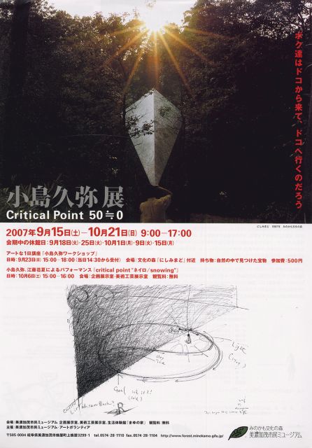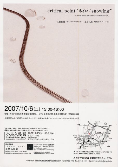 インタメから美?を渡り歩いた江藤莅夏と申します。その後も何かとお世話に なりました。 先日、地下鉄でVDの森田先生に遭遇して、お互いビックリ。 今週末10/6(土)に開催するポエトリーリーディングと映像インスタレーショ ンのコラボレイトイベントのお知らせです。 その時、あの向こう側ではどんなネイロが響いているの 『Critical Point ネイロ/snowing』 2007.10/6(土)15:00〜 美濃加茂 文化の森ミュージアム 美濃加茂市蜂屋町上蜂屋3299-1 お問合せ:0574-28-1110 http://www.forest.minokamo.gifu.jp/ アクセス