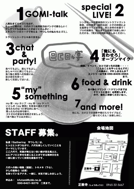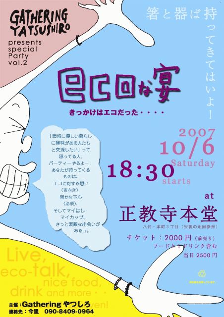 二見@熊本です。 こんにちは〜。 この週末は「森の感謝祭」に出かけていました。 実はここ一週間、過労からか微熱が続いていたのですが、焚き火の周りで踊ってたくさん汗をかいたら熱が下がりました。 大地とつながる祭りっていいなあ。 お会いした皆さん、素敵な時間をありがとうごさいました! さて、今回は「Gatheringやつしろ」からのお知らせでーす。 ========= 「ECOな宴(うたげ)」 開催決定! http://mixi.jp/view_community.pl?id=2174079 私たちGathering やつしろでは、来たる10月6日(土)に「E