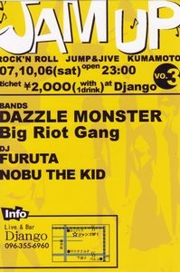 ROCK'N'ROLL JUMP&JIVE KUMAMOTO JAM UP vol.3 2007/10/06(sat) open23:00 tichet \2,000(ドリンク込) at Django ◆◇BANDS◇◆ ♪BIG RIOT GANG レゲエやスカのルーツミュージックでもある「jump,jive」の熟練たち! ♪DAZZLE MONSTER 全国でも珍しい完全ガールズロカビリーバンド!!kool kitty!! ◆◇Dj◇◆ ♪FURUTA 熊本のロカビリーDJのキーマン!! ♪NOBU THE KID RAGING NITE オーガナイザー!! http://mixi.jp/view_community.pl?id=1403936