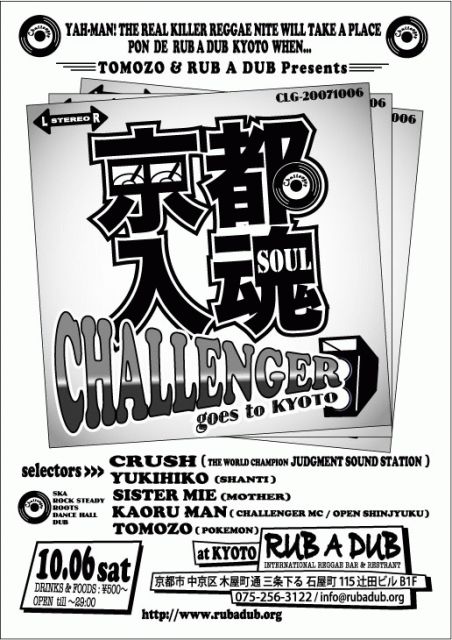 東京新宿のレゲエクラブ「OPEN」で開催しているイベント、CHALLENGERのクルーが京都RUB A DUBに来襲!します。