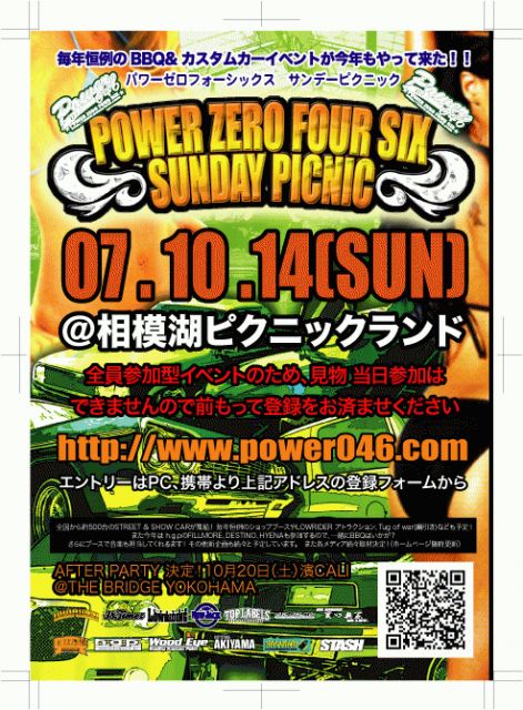 9月1日追記 【申し込み受付終了致しました】 沢山のお申し込み誠にありがとうございました。 お陰様で規定台数に達し、申し込み受付を終了させて頂きました。 登録済みの方で人数追加(車両追加は不可)の場合、または徒歩での御参加の方の受付は9月10日まで行います。 宜しくお願い致します。 -------------------------------------------------- 今年もヨロシクお願い致します。 POWER ZERO FOUR SIX SUNDAY PICNIC2007 主催 パワーゼロフォーシックス 日時 10月14日(日) 雨天決行 場所 相模湖ピクニックランド