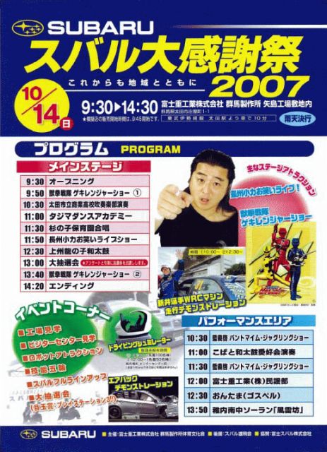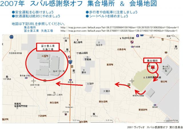 お楽しみにしていた方も多いのではないでしょうか? ついに迫ってきましたスバル感謝祭便乗オフ開催です! ■開催日時:2007年10月14日(日) 集合:AM10:00に移動を開始予定 ■待ち合わせ場所 太田運動公園駐車場 太田市飯塚町1059 http://map.jp.msn.com/default.aspx?lat=36.277320066415974&lon=139.39783573150635&lvl=15&mode=1 ■待ち合わせ場所までのアクセス 【東北道】館林ICで降りR354を西に進み、県道38号との交差点で右折(北上)し、大泉高校前を左折(西へ)するとスバルの大泉工場前を通り、工場が終わったところで左折