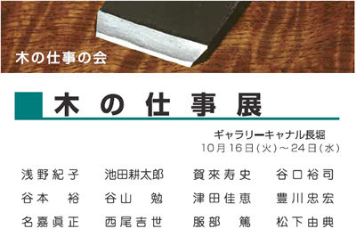 “木の仕事の会”のグループ展に出展いたします。 ◆開催期間 2007年10月16日(火)〜10月24日(水) 12:00〜19:00 最終日 17:00まで ◆出展予定者 浅野紀子 池田耕太郎 賀來寿史 谷口裕司 谷本裕 谷山勉 津田佳恵 豊川忠宏 名嘉眞正 西尾吉世 服部篤 松下由典 (五十音順/敬称略) ◆木の仕事の会とは 木工、製材、材木販売など木を扱う仕事を生業とする またはそれを目標とする個人・団体の集まりです。 htt