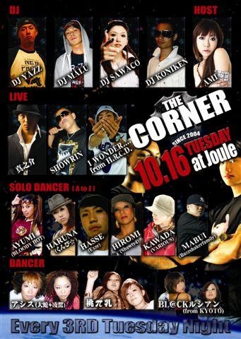 2007/10/16(火) 「THE CORNER」 ■場所 club joule ■LIVE 真之介 / SHOERIN / I WONDER (H.R.C.D) ■DJ YAZZ / MALU / SAWACO / KONIKEN ■SOLO DANCER A to Z AYUMI (BLOODY HOT) / HARUNA (くんぴ☆) / HASSE (Exze) / HIROMI (Shawty4) / KAWADA (VARIOUS) / MABUI (Bazzshakerfamily) ■DANCE アシス (大蛇+凌駕) / 桃π乳 / BL@CKルシアン ■NAVIGATE AMI ■時間 OPEN 23:00 〜 CLOSE 5:00 ■チケット 前売 2,000yen/w1D 当日 2,500yen/w1D ■お問い合わせ 真之介 : info@t-shinnosuke.jp