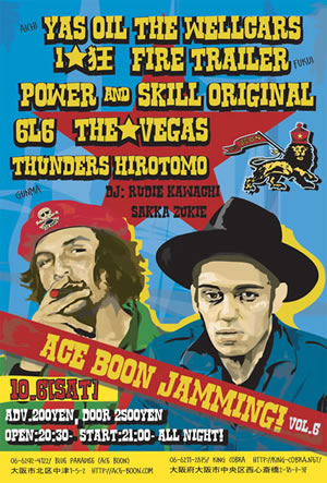 ACE BOON JAMMING! vol.6 REVOLUTION ROCK NIGHT! 10/6(SAT) at OSAKA KING COBRA open: 20:30- start 21:00- ALL NIGHT!! adv. 2000yen door 2500yen YAS OIL THE WELLCARS(Aichi) 1★狂 Fire Trailer (Fukui) Power & Skill Original 6L6 The★VEGAS Thunders Hirotomo (Gunma) DJ!! Rudie Kawachi Sakka Zukie 愛知のブルージーロックンロールバンド、ヤスオイル・ザ・ウェルカーズjamming!初参戦!!、 問答無用大阪YARD CORE一番星クルー、福井原発ロック、ファイヤートレーラー、お馴染み大阪ロックンロール勢はパワー&