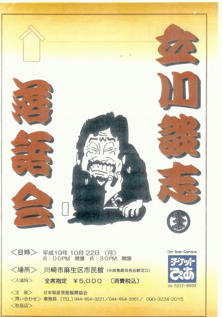 10月22日 立川談志 落語会 新百合ヶ丘駅北口にある麻生市民会館 6時開場 当日券あり 5000円 上記イベントの係を申し付けられましたm(__)m 近郊の方・小田急沿線の方^^ もしご都合があえば、まだ席もありますので^^ 是非皆さんふるってご参加をm(__)m よろしくお願いしますm(__)m