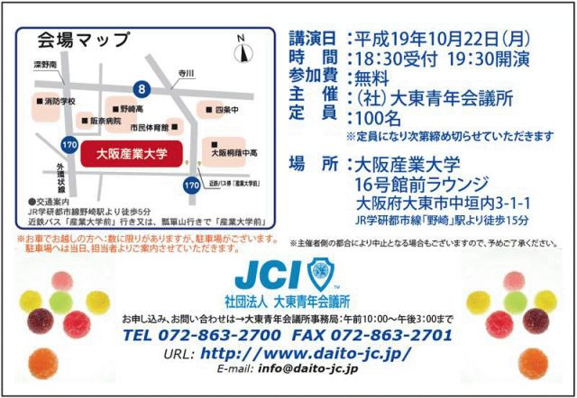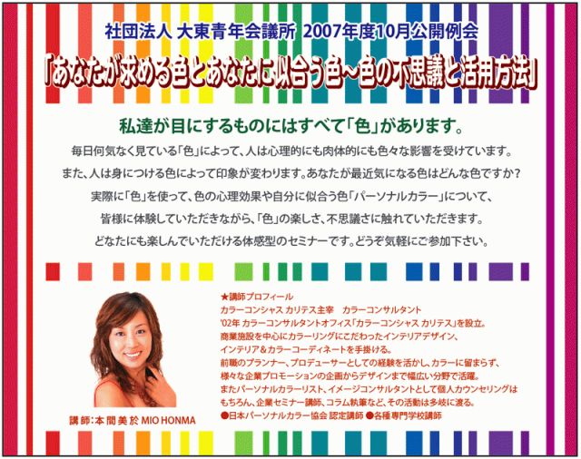 管理人さん、皆さん、無料講演会のお知らせをさせて下さい。 10月22日月曜日、大東青年会議所主催の講演会で http://www.daito-jc.jp/ カラーコンシャス カリテス主宰 本間美於が講師を務めます。 http://www.color-charites.com/ 公開の例会ですので、どなたでも参加が可能です。 色を塗ったり選んだり、誰でもが楽しんでいただけるものになっていますので ご友人、ご家族、男性女性とも、気軽にお誘い合わせの上ご参加下さい。 主催:社団法人 大東青年会議所 http://www.daito-jc.jp/ 場所:大阪産業大学 http://www.osaka-s