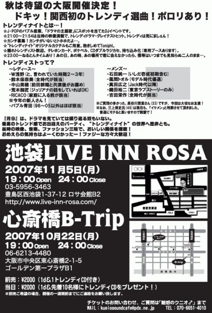 遂に! marchin***さんのご協力もあり、 大阪初進出が決定致しました。 今まで関西地区在住で参加を断念していた、 トレンディストの皆さん! 遂に告白タイムが訪れます!! 迷い込むならイリュージョン! そこは時を止めた楽園…。 “トレンディナイトin大阪” 〜ドキッ!関西初のトレンディ選曲!ポロリあり!〜 ジャンル:88'〜トレンディ・オールジャンル タイムゾーン:10/22(月)19:00〜24:00! トレンディスポット:心斎橋B-Trip 06-6213-4480 住所:大阪市中央区東心斎橋2-1-5ゴールデン第一プラザB1 http://ay
