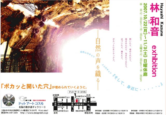 林和音 exhibition 自然の声を織る 自然とのキョリ 人とのキョリ『そして、身近に・・・・・。』 「ポカッと開いた穴」が埋められていくように。 といった長めなタイトル&キャッチフレーズですが2回目の個展をさせていただきます。 10月22日(月)〜11月3日(土) 平日12:00〜19:00 土曜日12:00〜4:30 ※日曜日は休廊です。 詳しくはギャラリーのHPです↓ http://www.designdot.co.jp/gallery-01.html (大阪のビル街ですが、