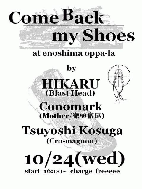 夏が終わっても海は終わってない!!遊びましょ♪ あの夏、夕焼けの海に消えていくmy shoes、いい思い出です☆ 「Come Back My Shoes」 DJ: HIKARU(BLAST HEAD) Conomark(Mother/徹頭徹尾/GRASSROOTS) Tsuyoshi Kosuga(Cro-magnon) start 16:00〜 Charge freee♪ at江ノ島Oppa-La(http://mixi.jp/view_community.pl?id=1983456)